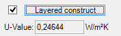 The calculated U-Value of a layered construct is shown in the U-Value field which is then marked read-only. The checkmark left to the button "Layered Construct" confirms, that the value shown is based on respective layered construct.