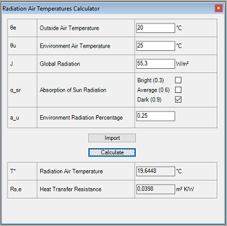 The radiation air temperature is a fictional temperature which is influenced both by the solar radiation and the long-wavelength radiation exchange. If an AnTherm user specifies the radiation air temperature instead of the exterior air temperature, this means that not only the diurnal solar radiation is considered but also the long-wavelength radiation exchange between the exterior surfaces of the exterior building components on the one hand and the sky and the terrestrial environment on the other. The use of the radiation air temperature implies that the absorption and reflection processes occur at the exterior building component surfaces. The used method is capable of exactly reproducing these processes. Until now, the user specified outside air temperatures in AnTherm as exterior boundary conditions. In the stationary case, this is a single value. In the instationary, periodic case this is the 24 values of a diurnal cycle.