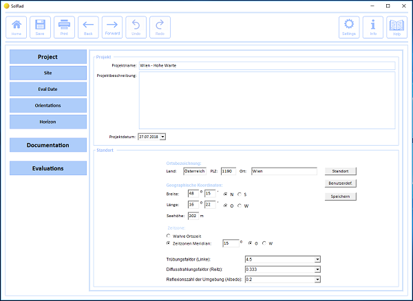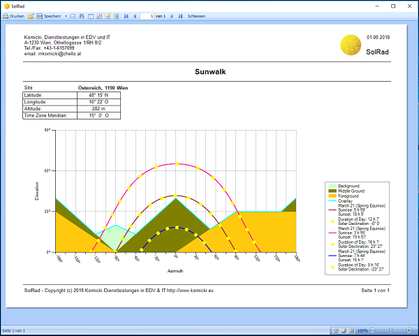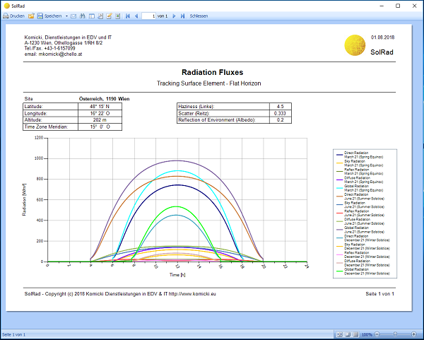 położenia Słońca (drogi Słońca), natężenia naświetlenia (natężenie promieniowania słonecznego) w odniesieniu do dowolnego położenia i nachylenia w kierunku ziemi oraz czasu trwania godziny słonecznej (ekspozycja na słońce) biorąc pod uwagę efekty cienia. (Zacienienie horyzontu-odbicie promieniowania.)