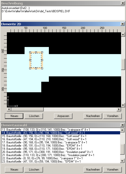 Das Feld "Elementanzahl optimieren" sollte im Normalfall angehakt bleiben. Die an das Programm übergebene Anzahl von Elementen wird dadurch klein gehalten. Das Feld „Polygonelemente gruppieren“ ist dann und nur dann anzuhaken, wenn die Bauteil-Bereiche, die in der DXF-Datei von einer Polylinie umrandet sind, als Bauteilgruppen interpretiert werden sollen. Wählen Sie die geringste Zahl von Dezimalstellen welche für die ausreichende Genauigkeit beim Einlesend der in der DXF Datei gespeicherten Geometrie sorgt. Sie haben die Möglichkeit zwischen einen dynamischen Raster und fixen Raster auszuwählen. Im fixes Raster können Sie die Rastergroße eintippen ab 0.1 mm bis 15 mm. Wird die Eingabemaske „Einstellungen“ mittels Anwählen von „OK“ verlassen, so erscheinen die vom Programm konvertierten Polylinien als Elemente. Nach dem Import der Geometriedaten werden Sie gefragt ob die zur Zeit in der Baustoffliste vorhandenen Baustoffeigenschaften an alle Elemente des importierten Modells, nach dem Namen, angewendet werden sollten. Anmerkung: Es empfiehlt sich auch Räume, Wärmequellen usw. in der zu importierenden Daten einzuschließen und diese dann nachzubearbeiten. Ab Version 10 gibt es Möglichkeit mehrere 2D-DXF Dateien in ein bestehendes Projekt zu importieren. Positionieren Sie die importierten Elemente mit Hilfe vom „Transformation/Verschieben, Rotieren“ Fenster, oder durch gehaltener Strg-Taste, der linken Maustaste und durch das ziehen der Maus um das Verschieben von mehreren Elementen auszulösen. Nachbearbeitung der importierten DatenDa von der DXF-Datei nur geometrische Daten und eine Vorbelegung in Hinblick auf Baustoffe und Bauteilgruppen abgerufen werden kann, muss die durch den Import in AnTherm eingelesene Baukonstruktion vor der Berechnung noch nachbearbeitet werden. Arbeitsschritte:![]()