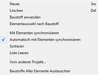 Synchronisation der BaustofflisteDie Liste der in diesem Fenster angebotenen Baustoffe kann mit den in dem Modell bereits benutzten Synchronisiert (ergänzt) werden, sodass alle in dem Bauteilmodell benutzten Baustoffe auch hier ersichtlich sind. Damit wird gewährleistet, dass die direkt im Element Editor dem Element zugewiesenen Baustoffeigenschaften auch in die projektspezifische Liste als zusätzliche Einträge angefügt werden. Die sofortige Synchronisation kann vom Kontextmenü der Baustoffliste "Mit Elementen synchronisieren" durchgeführt werden oder erfolgt Automatisch während eines jeden Elementauswahlvorganges sofern die Programmeinstellung "Automatisch mit Elementen Synchronisieren" eingeschaltet ist. Die Synchronisation erfolgt etwa in folgenden schritten: