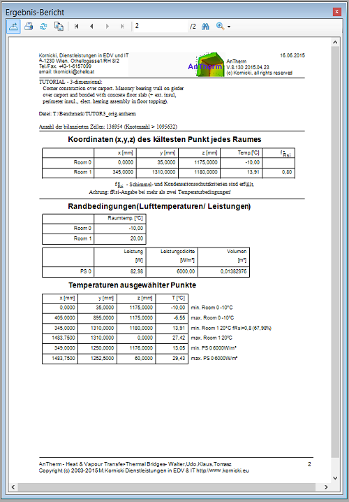 Ergebnis-BerichteDer Ergebnisse-Bericht dient zur Ausgabe der zu den angegebenen Randbedingungen auftretenden kältesten Punkte eines jeden Raumes mitsamt der Koordinatenangabe und der Gewichtungsfaktoren. Die von den gewählten Randbedingungen abhängigen Berechnungsergebnisse verlangt man über das Anwenden der im Fenster Randbedingungen eingegebenen Werte. Die aus diesem Bericht gewonnenen Ergebniswerte dienen den Aussagen über die Erfüllung (bzw. Nicht-Erfüllung) der kritischen Kondensation- und Schimmelbildungsschutzkriterien (siehe auch EN ISO 13788). Aufgrund der Randbedingungen berechnet das Programm für jeden an die Baukonstruktion grenzenden Raum die tiefste Oberflächentemperatur und die Koordinaten jenes Punktes, in dem diese auftritt. Für diese Punkte tiefster Temperatur werden auch die g–Werte (die Gewichtungsfaktoren) berechnet. Neben den Tiefsttemperaturen werden auch die zugehörigen Grenzfeuchten ermittelt [1]. Für die Berechnung der Oberflächengrenzfeuchte kommen die Formeln der Partialdruckberechnung nach der EN ISO 13788:2002 zur Anwendung. Die Auswertung wird über den mit den Randbedingungen superponierten Basislösungen ausgeführt (im Bericht mit der Zahl der Gleichungen bzw. Zellen angegeben) und dann weiter verfeinert zur Super-Fine-Lösung (mit der Zahl der ausgewerteten Knotenpunkte angegeben). Randbedingungen und kritische ErgebnisseFür jeden an das modellierte Bauteil anschließenden Raum werden folgende Ergebnisangaben gemacht:
