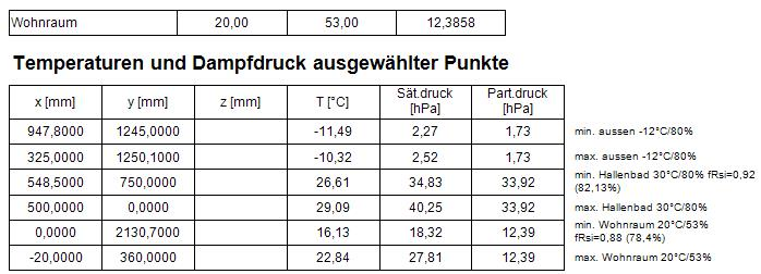 Die Werte gelten für diese Punkte unabhängig von den Randbedingungen und sind als Bauteilkenngröße anwendbar. Die Summation der mit der jeweiligen Randbedingung multiplizierten g-Werte eines Punktes liefert die an diesem Punkt resultierende Temperatur. So ist es möglich, unter der Annahme, dass unter anderen Randbedingungen die Lage der Kältepole unverändert bleibt, die Temperaturen auch unter veränderten Randbedingungen an diesen Stellen, sogar mit einer einfachen Handrechnung, zu ermitteln. Anmerkung: Die Summe aller zu den Temperaturrandbedingungen (Räume) gehörenden g-Werte eines Punktes (Summe der Werte in einer Spalte ohne der den Wärmequellen zuzuordnenden Zeilenwerte) ist immer 1. Anmerkung: Wenn die Zahl der in der Matrix auszugebenden Spalten die Seitenbreite überschreitet, so erfolgt die Ausgabe der die Seitenbreite überlaufenden Spalten jeweils in Gruppen untereinander angeordnet. Koordinaten der kältesten PunkteIn der Liste der X/Y/Z-Koordinaten der kältesten Punkte im Ergebnisbericht werden auch die Temperatur des Punktes und das zugehörige f*Rsi angegeben. Koordinaten der kältesten Punkte