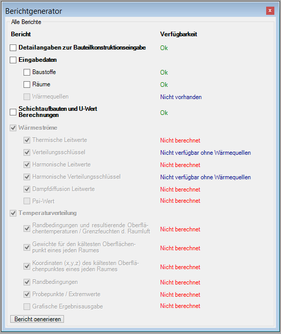 Berichtgenerator-Fenster![]() Der Berichtgenerator ermöglicht es Ihnen, vollkommen benutzerdefinierte Berichte zu erstellen. Sie können aus einer Reihe von vordefinierten Berichtbausteinen jene Teile auswählen, die Sie für Ihren Bericht benötigen. Der Berichtgenerator besteht aus einer Tabelle mit 2 Spalten und einem Knopf zur Berichtgenerierung. Die erste Spalte zeigt die Berichtbausteine und die zweite Spalte gibt über die Verfügbarkeit eines Berichtbausteins Auskunft. Um einen Berichtbaustein für den zu generierenden Bericht auszuwählen, setzen Sie einfach ein Häkchen neben dem jeweiligen Berichtbaustein. Die Berichtbausteine sind nach der Häufigkeit, mit der sie gemeinsam in einen Bericht einbezogen werden, gruppiert angeordnet. Wenn Sie eine Gruppe anhaken oder das Häkchen entfernen, werden alle Berichtbausteine der Gruppe ausgewählt bzw. abgewählt. Die Verfügbarkeit eines Bausteins hängt von mehreren Faktoren ab: Ein Berichtbaustein kann ggf. nicht verfügbar sein, wenn das momentane Modell das Artefakt, das der Bericht darstellen soll, nicht beinhaltet. Z.B., wenn Ihr Modell keine Wärmequellen enthält, ist der Wärmequellen-Berichtbaustein entsprechend inaktiv. Die Verfügbarkeit mancher Berichtbausteine hängt auch vom Fortschritt der momentanen Berchnung ab. Wenn Sie z.B. die thermischen Leitwerte noch nicht berechnet haben, ist auch der entsprechende Bericht nicht verfügbar. Wenn Sie alle Bausteine wie gewünscht ausgewählt haben, können Sie den Bericht über den Knopf unten im Fenster generieren. BerichtbausteineDie Berichtbausteine sind in folgende Gruppen unterteilt:
