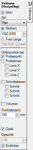 Die Steuerungspaneel Vektoren (HedgeHog) dient zur Vergabe der Parameter der Darstellung der Vektorfelder mit Pfeilsymbolen.