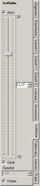 Siehe auch: Ergebnis 3D Fenster, Aktiv (Einstellung), Opak und Opazität (Einstellung), Einfärben (Einstellung), Körper oder Drahtmodell (Einstellung), Allgemein (Steuerungspaneel), Aktive Funktion, Isolinien (Isothermen)