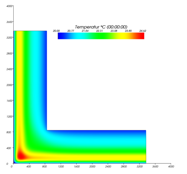 Gemäß EN ISO 10211 (ÖNorm EN ISO 10211, 2007) wird das Berechnungsmodell – ein Horizontalschnitt durch die Kante - im Abstand von 2,52 m von der Kante, gemessen an der Innenseite, durch adiabatische Ebenen begrenzt. Abb. AnTherm Modellierung der Vollziegel Wankante – 2D Elemente Fenster 3D Ecke FundamentplatteDie Berechnung von erdbodenberührten Bauteilen erfordert in den meisten Fällen eine dreidimensionale Modellierung. Zwei- oder gar ein-dimensionale Berechnungsmodelle können die Ansprüche auf hohe Planungssicherheit nicht erfüllen. Zum anderen sind weite Bereiche im Umfeld des Gebäudes vom Wärmeabfluss aus dem Gebäudeinneren betroffen. Aus diesem Grund spielt die Wärmespeicherfähigkeit des Erdreichs eine sehr wichtige Rolle. Die Berechnung muss somit zeitabhängig (instationär) erfolgen. Untersucht wird also die Ecke einer Fundamentplatte eines Gebäudes im Passivhausstandard. Die zugehörige Außenwand soll bis zu einer Höhe von einem Meter mit modelliert werden. Das Grundsystem besteht aus einer 20cm Stahlbeton-Fundamentplatte, die auf 20cm extrudiertem Polystyrol-Schaum (XPS) aufliegt. Die Außenwandstellt eine Holzständerwand mit Glaswolle-Zwischendämmung dar, innen eine Installationsschicht mit Gipskartonabschluss, außen eine 20cm EPS bzw. XPS Schicht. Der Wandaufbau ist insgesamt 46 cm dick und besteht aus (von außen gesehen):