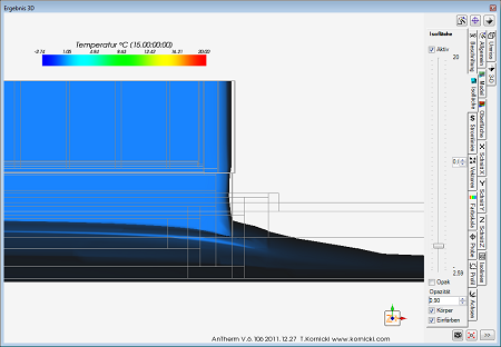 Die 12 Monatsmittelwerte des Temperaturverlaufs können bequem durch Doppelklick der Felder in der Wert-Spalte des Periodischen Daten-Editors eingegeben werden. Die Eingabe erfolgt interaktiv: Sobald ein Wert angegeben wurde, wird das Diagramm aktualisiert und die Werte können visuell überprüft werden. Es besteht auch die Möglichkeit die Balken im Diagramm in der Höhe zu skalieren, indem man die obere Seite eines Balkens klickt und gleichzeitig verschiebt. Jedoch empfiehlt sich bei vorbereiteten Temperaturwerten - für eine exakte Eingabe - die editierbare Tabelle zu verwenden. Speichern sie nach Eingabe der Werte diesen Datensatz unter File->Save as… um es für etwaige spätere Verwendung wieder abrufen zu können. Bestätigen sie die Eingabe mit „Apply“. Sie sind nun zurückgelangt zu dem Übersichtsfenster der Randbedingungen. Wie im 2D Wandkanten-Beispiel erläutert können sie auch hier wiederum durch Klick auf „Timelines“ die zeitlichen Verläufe der Randbedingungen kontrollieren. Der Knopf „Animate“ erlaubt es eine Animation über einen beliebigen Zeitraum als Video zu exportieren. Diese Funktion ist jedoch erst ausführbar, wenn das 3D Ergebnisfenster bereits geöffnet ist und eine gewünschte Darstellung festgelegt wurde. Es kann nun ein Zeitpunkt für die Untersuchung festgelegt werden oder es kann auch eine Animation über den Jahresverlauf erstellt werden. Dies wird in dem Bereich „Grafische Auswertung“ Schritt für Schritt erläutert. Bestätigen Sie den Satz der Randbedingungen nun in dem Sie auf die Schaltfläche Anwenden klicken. Nach einer kurzen Wartezeit, in welcher die Temperaturverteilung im Bauteil errechnet wird, erscheinen Ergebnisse im Ergebnis Bericht. Grafische AuswertungenBei der transienten Simulation kommt die Zeit als weitere Dimension hinzu. Es kann nun in gewohnter stationärer Manier jede beliebiger Zeitpunkt (Angabe in Sekunden) der gewählten Periode untersucht werden - die grafische Auswertung erfolgt dann - nach Bestimmung des Untersuchungszeitpunktes im Randbedinungen Fenster - auf dieselbe Art und Weise wie bei der stationären Berechnung. Dies ist schon detailliert beschrieben worden und kann im Tutorial „Zweidimensionale Untersuchung“ bzw. „Dreidimensionale Untersuchung“ nachgelesen werden. Es besteht nun aber auch die Möglichkeit die Temperaturverteilung beispielsweise auf einer festgehaltenen Schnittebene für verschiedene, aufeinander folgende Zeitpunkte in bestimmten Zeitabständen in Art einer Diashow darzustellen. Diese Art der Visualisierung vermittelt dem Benutzer ein Gefühl über die Effekte der Wärmeleitung und Wärmespeicherung im Bauteil über einen spezifizierten Zeitraum. Im folgenden Abschnitt soll eine Animation über den Jahresverlauf der Temperaturverteilung in den beiden Modellen (2D Wandkante und 3D Fundamentplatte) erstellt werden. 2D WandkanteNach der Anwendung der Randbedinungen auf die Berechnung wählen sie eine geeignete Ansicht im 3D-Ergebnis Fenster wie beispielsweise folgende Abbildung zeigt – sie können natürlich beliebige Darstellungen wählen (Isolinien, Wärmestromlinien, etc.). Wenn sie wir hier die Farbskala mit Beschriftung darstellen wollen, achten sie auch drauf, dass im Reiter „Farbskala“ im Ergebnis 3D Fenster die Option „Fester Werteberich“ aktiviert ist, dass sich nicht für jeden Zeitpunkt der Animation eine dynamischer Wertebereich einstellt (für den Vergleich nicht passend). Sie können den Wertebereich auch anpassen um während dem Verlauf der Temperaturen über die Zeit ein passenderes Ergebnis erhalten. Sie könnten es beispielsweise zwischen 16°C und 30°C festlegen. Abb. 3D Ergebnisfenster der 2D Wandkante zum Zeitpunkt 0 mit dynamischen Wertebereich für die Farbskala Da die Voraussetzungen für den Export einer Animation nun gegeben sind, können sie zum Randbedingungen Fenster wechseln: Abb. Randbedingungen Fenster mit dem Animate Button zur Erstellung von Animationen Klicken sie den „Animate“ Button um eine Animation zu erstellen. Darauf folgend öffnet sich ein Fenster für die Einstellungen der Animation: Abb. Animate Dialog für die Einstellungen der Animation In dem „Animate“ Dialog ist die Periodendauer bereits voreingestellt, auf Wunsch jedoch änderbar. Für diese Demonstration wurde die gesamte Periodendauer - also der gesamte Tagesverlauf - beibehalten. Die „Time Step Length“ – der Intervall bis zum nächsten Auswertungsframe – ist hier mit 1800 Sekunden festgelegt worden, um alle 30 Minuten die Veränderung des Temperaturfeldes in der Animation darzustellen. Aktivieren sie auch die Option „Record animation to AVI File“ um die Animation als Videodatei zu exportieren. Mit „Start“ wird dann ein Dialog geöffnet, der bestimmt wo sie die Animation speichern wollen. Geben sie einen geeigneten Namen an und bestätigen sie mit „Speichern“. Bevor die Animation beginnt (und gleichzeitig die Videodatei geschrieben wird), scheint noch ein letzter Dialog mit Einstellungen für die Videokomprimierung, die sie aber standardmäßig mit „Ok“ überspringen können. Nach Ablauf der Animation ist auch die gewünschte Videodatei erstellt, die man in einem beliebigen Videoplayer abspielen kann. Sehr gut kann man bereits bei diesem 2D Beispiel im Eckbereich eine „Wärmeblase“ erkennen. Erst die instationäre Simulation ermöglicht es solche Effekte zu erkennen und zu analysieren. 3D Ecke FundamentplatteNachdem sie im Fenster „Randbedingungen“ die Schaltfläche Anwenden geklickt haben, hat sich neben dem Ergebnisbericht auch das 3D Ergebnisfenster geöffnet. Frostgrenze ermittelnDie Frage nach der Frostgrenze im Erdboden spielt eine wichtige Rolle. Da es um die Sicherstellung frostfreier Gründungen geht, kann die auf eine im langjährigen Schnitt zutreffende Berechnung nicht unmittelbar verwendet werden. Um Sicherheit zu erhalten, müssen extreme winterliche außenklimatische Verhältnisse angesetzt werden. Im gegenstä