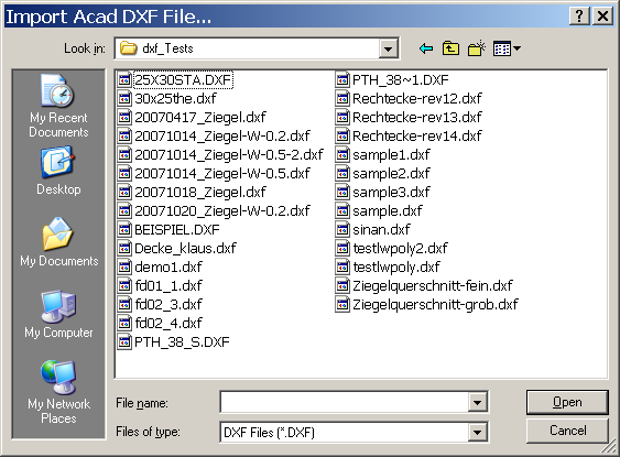 Import of DXF file![]() If there is a construction available as a DXF file (e.g. created with AutoCAD® or other CAD application), it can be easily imported and used as a template for creation of a two dimensional component model . Only specifically prepared DXF files can be imported. Only if a DXF file conforms to specific criteria it can be imported into AnTherm. To start the DXF file import, select the men File→Import→Acad-DXF. The file browser shown provides the ability to search for DXF files. Select the DXF file to import and press "Open" or double click onto the file requested. From AnTherm version 10.137 there is the possibility to import several DXF files into an existing project. The DXF file is read in and all polylines are processed. Prior to actual conversion you will be shown an import settings dialog. The import settings dialog is used to control how the contents of the DXF file imported are interpreted by AnTherm.