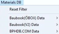 Remark: Drag-Drop is being initiated with right mouse botton out of data record mark (left to data fields). Remark: For technical reasons there are some columns hidden from the user. While tabbing between the fields the text cursor might hide also - simply press the TAB key again to reveal the focus. Remark: Materials database data is stored within the file "Baustoffe.xml" within installation folder of the application and is loaded during this window is opened. You can modify this file within Excel or text editor if required. Remark: If Baubook/öbox-Data or BPHDB.COM-data is available within the Download-Folder it will be loaded during this window is opened (the load operation might lead to slight delay before the window is displayed). Materials DB menu