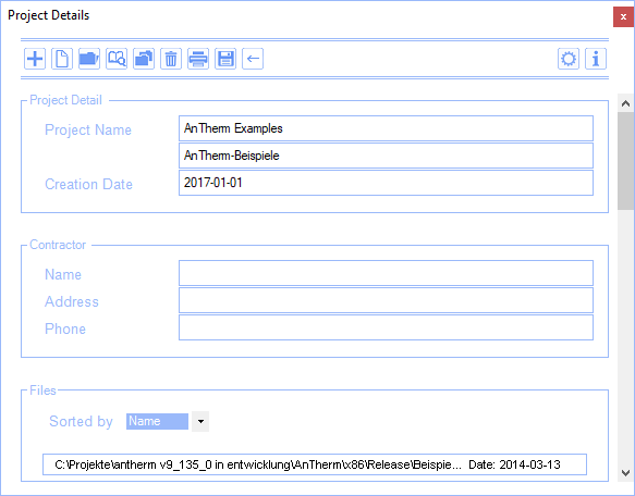From AnTherm Version 9 on, there is the Menu Project. This menu allows the user to select project files from an existing project (such as "AnTherm-Examples") and open them. Moreover, the user can create new projects and add project files to them. In addition, there are functions such as copy or delete. This menu is supposed to make it easier for users to preserve an overview of all projects and project files. But the traditional way of accessing project files directly via the Menu File is still enabled.