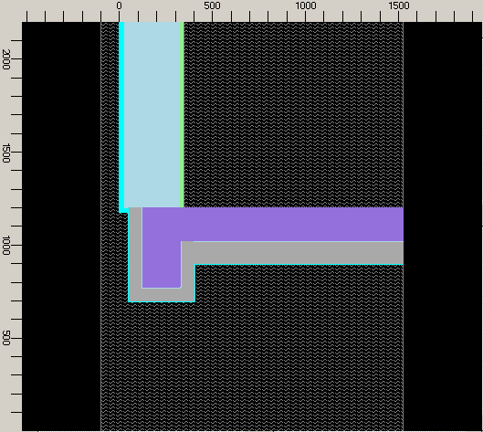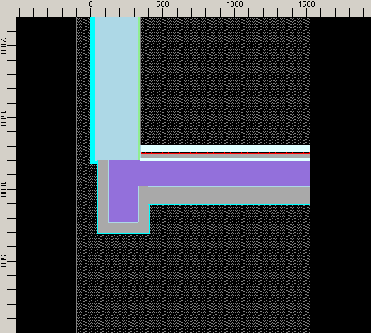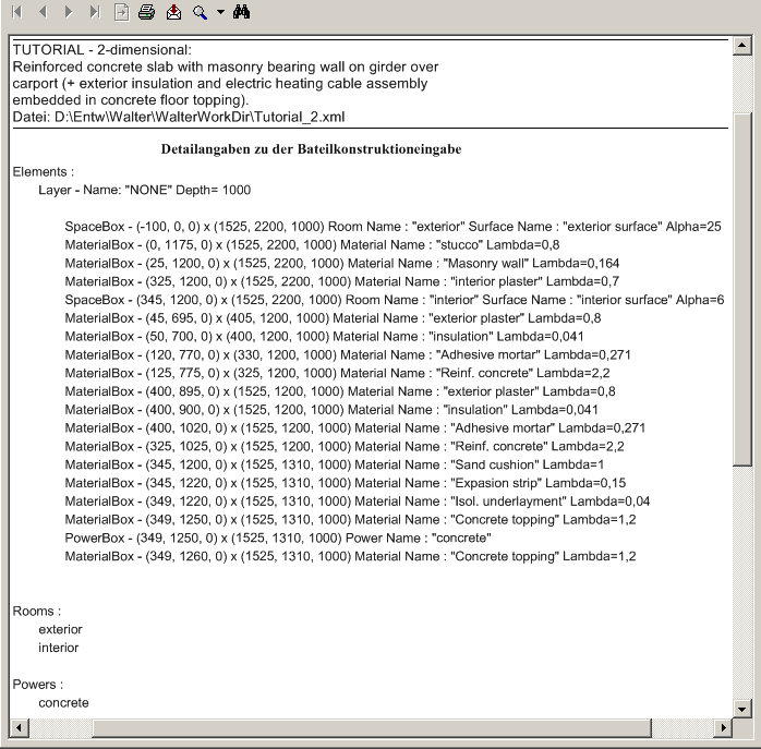 The interior flooring over the concrete slab is built up with the last five elements of the aggregate: elem. 14, sand: X_1: 345 X_2: 1525 Y_1: 1200 Y_2: 1310 elem. type :Material material: sand elem. 15, exp. strip: X_1: 345 X_2: 1525 Y_1: 1220 Y_2: 1310 elem. type :Material material: exp. strip elem. 16, isol. layer: X_1: 349 X_2: 1525 Y_1: 1220 Y_2: 1310 elem. type :Material material: isol. layer elem. 17, concrete (then wrapped with heat/power source): X_1: 349 X_2: 1525 Y_1: 1250 Y_2: 1310 elem. type :Material material: concrete topping The concrete shall also be attached to the power source (heating source). This is being done by wrapping the assigned are by the Power Box type of a element - as described in the reference, a Power Box has not interior, it does wrap interiors of Material Boxes. To get exactly the same rectangle assigned to the next element as that of element 17, select Duplicate from the context edit menu (by right-clicking either at the last element in Element Browser or right-clicking over Box Editor an selecting Duplicate) elem. 18, concrete wrapper with heat/power source: X_1: 349 X_2: 1525 Y_1: 1250 Y_2: 1310 elem. type :Power Box power name: concrete TAB to Box Type and change the entry to "Power Box". The TAB to Power(source) name and enter "concrete" thus naming the Power Source Boundary Condition which can later be assigned with Power. After confirming the entry of this Power Source continue with the last material element: elem. 19, concrete topping: X_1: 349 X_2: 1525 Y_1: 1260 Y_2: 1310 elem. type :Material material: concrete topping