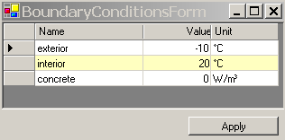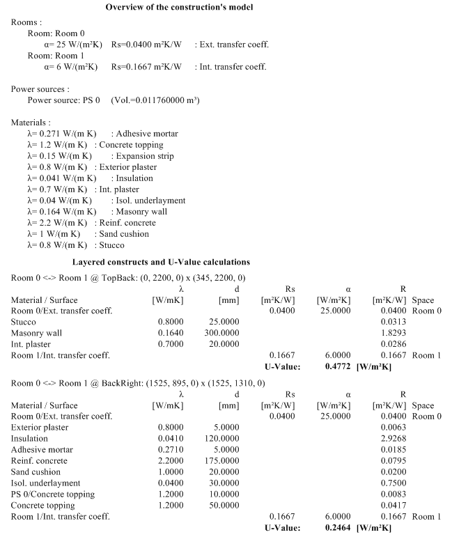 Calculating the Psi-Value (linear thermal transmittance) characteristic for that component is still independent from any boundary conditions too. Obtaining results dependant on particular boundary conditions (space air temperatures and power source intensities) requires the input of that data at first: The heat source is thus "turned off" for the first round of evaluation. Confirm the set of boundary conditions by clicking at Apply on the Boundary Conditions window. After a short waiting period, during which the temperature distribution in the component is calculated by the program, the following results are shown in Results-Report.