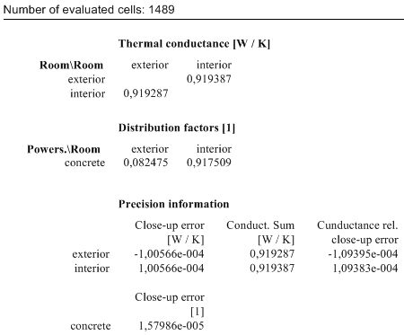 Note: The conductance matrix results shown here are only "borderline acceptable" in terms of precision. For some purposes, a re-calculation of the base solutions with a more stringent termination condition may be called for at this point, before continuing with evaluation. For a demonstration object, however, the precision of these results will suffice. The table of heat source distribution factors is printed out separately. These results imply that the heat source, i.e. the simulated electric heating assembly meant to heat space "concrete", would lose approximately 8% of its power to the exterior space - without flooring over the concrete topping. Note: Just as the conductance matrix, the heat source distribution factors are condition-independent, i.e. valid for any temperatures and source powers of evaluation. Activate View→Windows→Psi-Value Determination menu.
