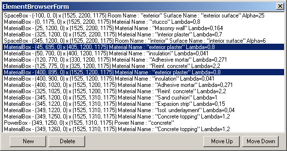 X_1: 125 X_2: 1525 Y_1: 1025 Y_2: 1200 The cross-section for this and several of the following model layers shows the perimeter brick as well as the insulation along the edge of the floor slab. For this part of the construction, two new elements must be inserted into the component group "under" the element of reinforced concrete. Select "Reinf. concrete" in Element Browser. Right-Click on it and select "Add→Before Selected". Edit the input Data: X_1: 85 X_2: 1525 Y_1: 1025 Y_2: 1200 Type: Material Box Double-Click over the Lambda field to reveal the list of Materials. Select insulation and drag it onto Element Editor - drop it there assigning properties of insulation to the newly create element. Material Name: insulation Lambda: 0.041 The new element 6 - insulation - is generated upon confirmation (TAB), and the reinforced concrete element is now number 7. The perimeter brick element shall be inserted "under" the insulation. Select "insulation" in Element Browser. Right-Click on it and select "Add→Before Selected". Edit the input Data: X_1: 25 X_2: 1525 Y_1: 1025 Y_2: 1200 Type: Material Box Material Name: Perimeter brick Lambda: 0.5 Make sure, that the sequence of elements corresponds to the following (starting from element 5 down here): ??????????????????